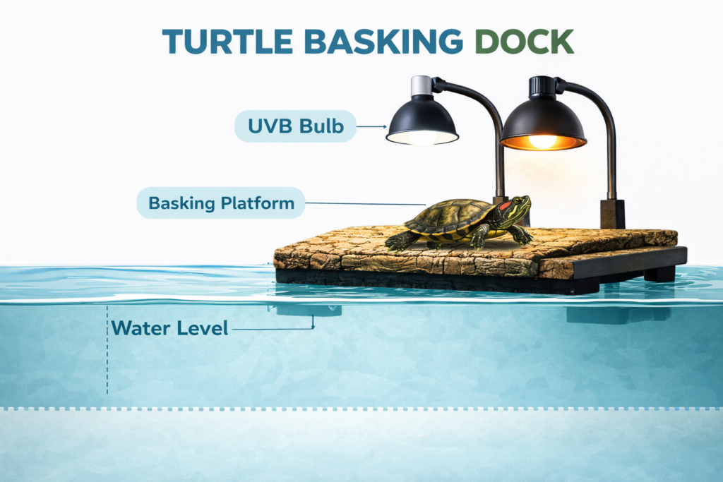 The basking platform should allow the turtle to fully dry its shell and should be positioned directly under the heat lamp and UVB lighting.